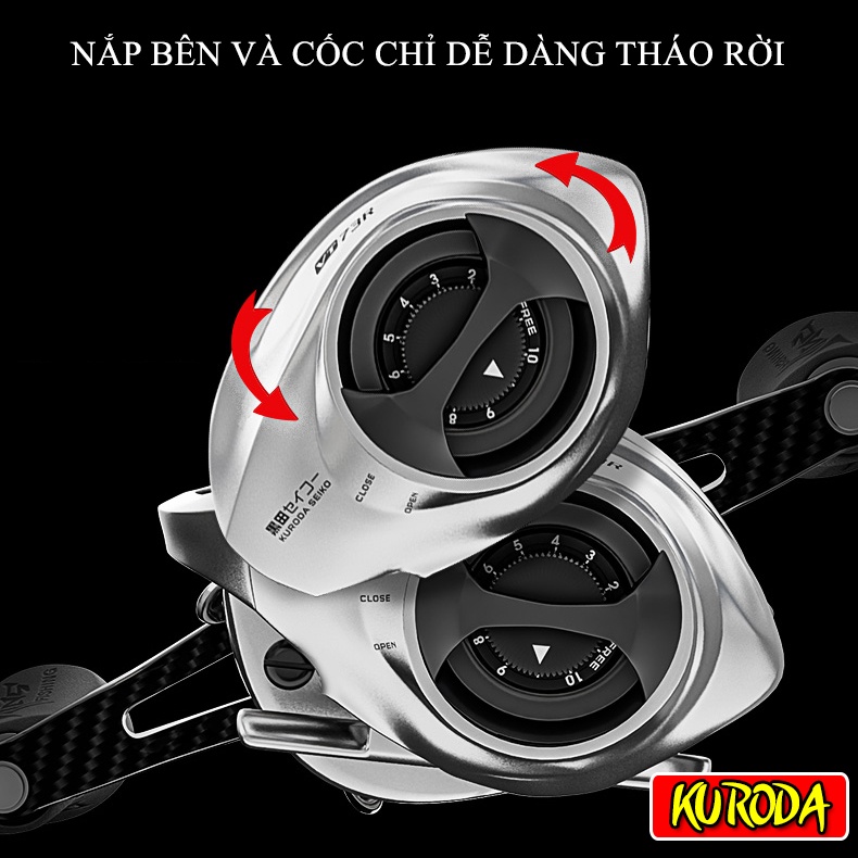 Máy Ngang SEKIO KURODA - New 2022 - Chất Lượng Cao - Bền Bỉ Tinh Tế - SK03 - Máy Ngang SEKIO KURODA là mẫu máy mới được ra mắt của thương hiệu SEKIO với mục đích đưa người chơi thêm những trải nghiệm những mẫu máy ngang giá tầm trung nhưng chất lượng vô cùng tốt,với thiết kế tinh tế vẻ bề ngoài và chắc chắn bền bỉ với cấu tạo của bộ nhồng đồng,đây chắc chắn sẽ là 1 sự lựa chọn của anh em. - Thông tin chi tiết : + Khung thân bằng carbon thiết kế gọn nhẹ trọng lượng 215g + Cốc chỉ ( Spool) được làm bằng hợp kim và có các rãnh thoáng khí giúp nhanh khô dây + Tay Cầm và ngôi sao được làm bằng kim loại cho kiểm soát lực tốt và bền bỉ + Lỗ ra dây hình elip được làm bằng sứ cho khả năng ra dây mượt mà. + Mặt bên hông và ống chỉ dễ dàng tháo nắp, dễ dàng vệ sinh * Thông số chi tiết + Trọng Lượng Máy : 215g + Garito : 7.3:1 + Drag / Lực hãm : 8kg + Sức chứa dây : 0.26mm / 120m + Máy có 3 màu : Màu đen, màu đỏ và màu bạc ( trong đó màu bạc là phiên bản được thiết kế tay quay carbon )