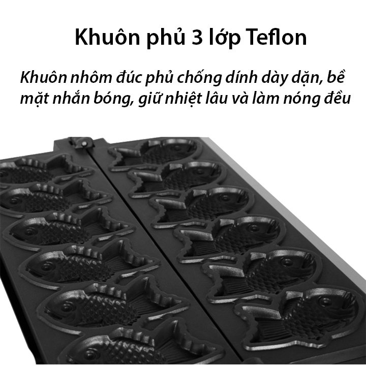 ⭐ ƯU ĐIỂM 1. Sử dụng chất liệu thép không gỉ, có phủ Teflon chống dính. 2. hiệu quả cao, khoảng 3-6 phút để làm ra 6 chiếc taiyaki 3. Taiyaki hình cá vàng thiết kế theo phong cách Nhật Bản, đẹp mắt, được ưa chuộng trên thị trường toàn cầu. 4. Đi kèm với bộ điều nhiệt và hẹn giờ độc lập, giúp bạn nướng taiyaki thật dễ dàng.