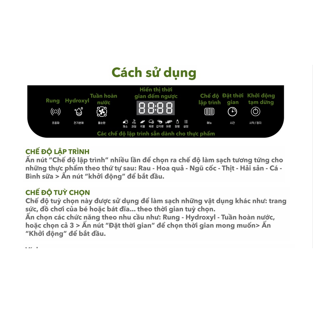 - Thực phẩm sau khi được rửa qua máy có thể loại bỏ đến 99,99% các chất gây hại cho sứ.c khỏe, khử mùi hôi, tanh, sạch hơn cả phương pháp rửa truyền thống.