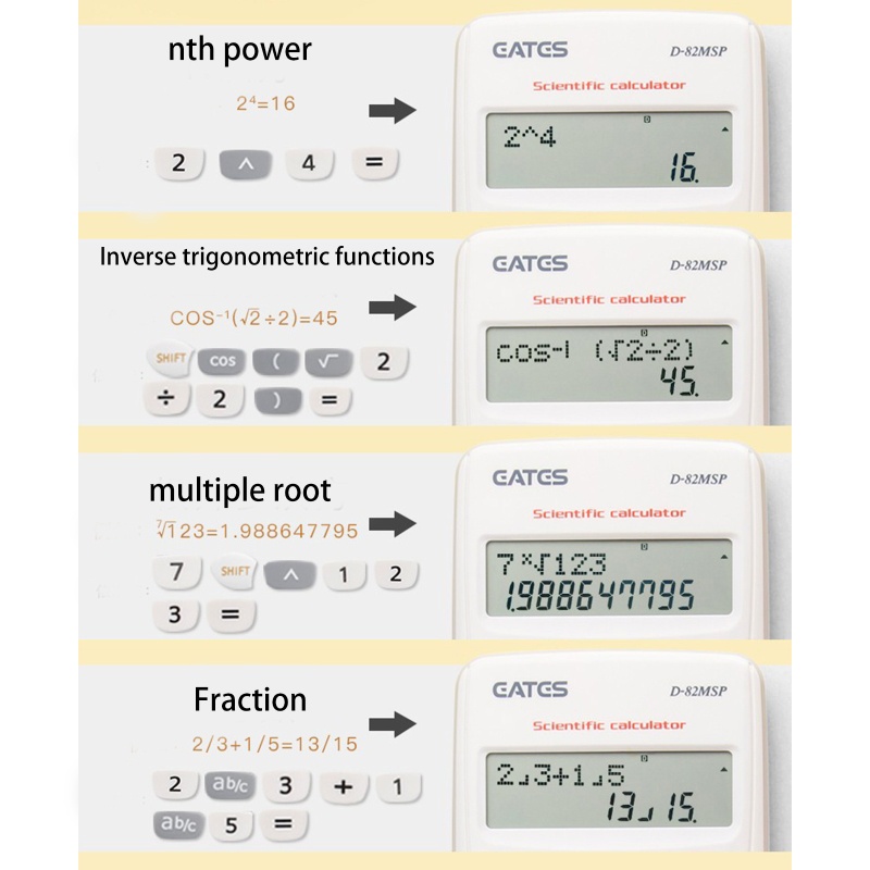 240 Chức năng Máy tính 12 chữ số Thống kê Sinh viên Toán học 2 Dòng Hiển thị Các tính năng: Hiển thị 2 dòng 40 phép tính khoa học Chức năng đa phát lại, cho phép tính ma trận, phép tính phương trình, phép tính vectơ-, phép tính vi phân, hàm SOLVE, v.v. 240 Chức năng 10 + 2 chữ số tính toán kỳ thi học sinh màu. Tính toán phân số / Tính toán tích hợp / Thống kê (Trình chỉnh sửa dữ liệu STAT, Độ lệch tiêu chuẩn, Tính toán phân phối bình thường, Phân tích hồi quy) Các phép toán logic, tính toán số phức, tính toán ký hiệu kỹ thuật