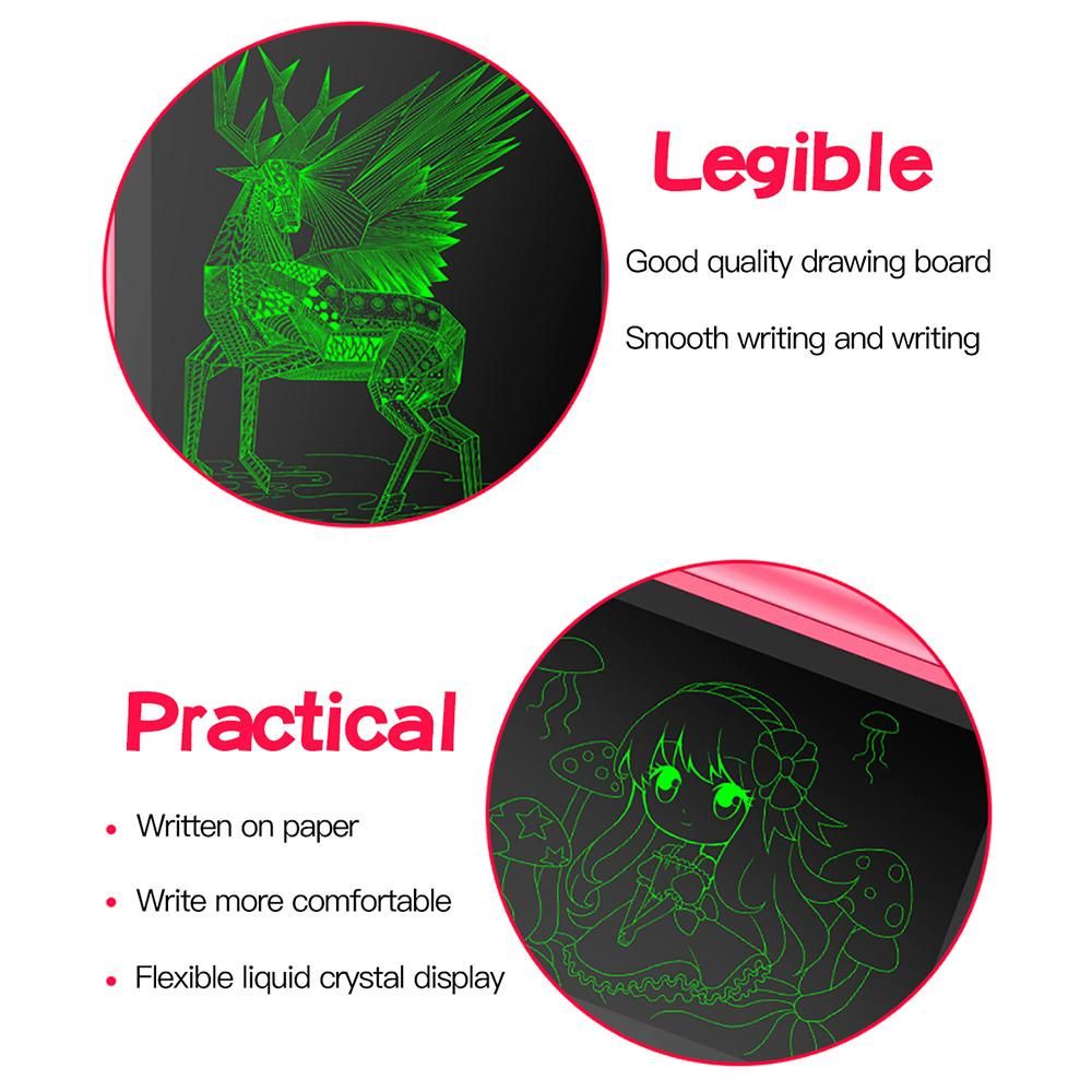 Áp suất đầu vào: 300G Chất liệu: Màn hình LCD, khung ABS Màu sắc: Đen, Xanh, Hồng Trọng lượng sản phẩm: 35g / 1.23oz Kích thước màn hình: 4,5 inch Kích thước sản phẩm: 11.8 * 88cm Nguồn điện: Tích hợp pin nút CR2025 Đặc trưng: Sản phẩm sử dụng công nghệ tinh thể lỏng linh hoạt công nghệ cao, phụ thuộc vào cảm ứng áp suất để hiển thị văn bản, hình ảnh và đồ họa. Bảo vệ mắt & Màn hình LCD đầy màu sắc, Viết và vẽ bằng bút cảm ứng hoặc ngón tay đi kèm mà không có bất kỳ độ trễ nào, trải nghiệm viết tuyệt vời. Một giải pháp thay thế cho giấy truyền thống, Xóa hình ảnh của bạn bằng nút Chạm vào Xóa, giúp bạn tiết kiệm rất nhiều tiền. Sản phẩm tốt cho trẻ em trong cuộc sống hàng ngày và học tốt cho các bài thực hành Viết, Số học, Chính tả và Vẽ. Hoàn hảo để viết danh sách việc cần làm, danh sách mua sắm, lời nhắc cuộc hẹn, bản ghi nhớ ngắn và để lại ghi chú cho bạn bè và gia đình. Sản phẩm có thể được xóa hơn 100000 lần. Bạn không cần dùng tẩy mà chỉ cần nhấn nút, màn hình sẽ sạch trở lại. Thân thiện với môi trường và kinh tế. Tiết kiệm nhiều giấy tờ! Tiết kiệm nhiều cây cối!