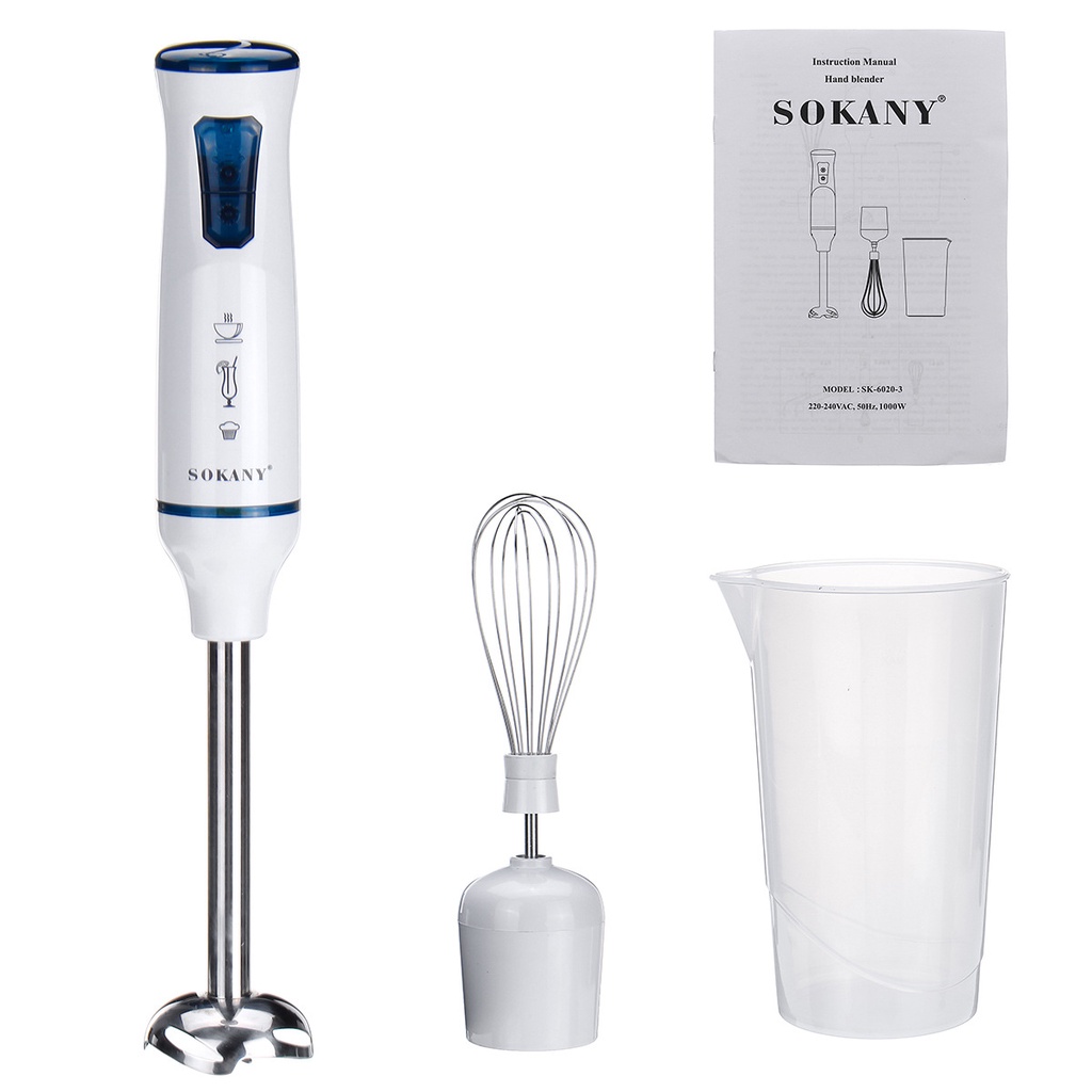 THÔNG TIN SẢN PHẨM MÁY XAY Sokany SK-6020-3: - Công suất 1000W - Máy xay 3 trong 1: Bộ phận lưỡi dao xay, bộ phận đánh trứng, ly đi kèm - Lưỡi dao bằng thép không rỉ 4 lưỡi - Nguồn điện 220 - 240V, 50/60Hz
