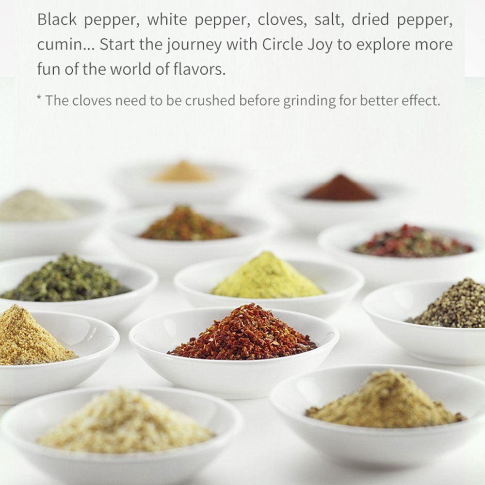 Áp dụng cho phần lớn gia vị của sở thích hương vị để bạn khám phá Tiêu đen, tiêu trắng, đinh hương, muối, tiêu khô, thì là... Bắt đầu cuộc hành trình với Circle Joy để khám phá thêm nhiều niềm vui cho thế giới hương vị. * Cần nghiền găng tay trước khi mài để có hiệu quả tốt hơn