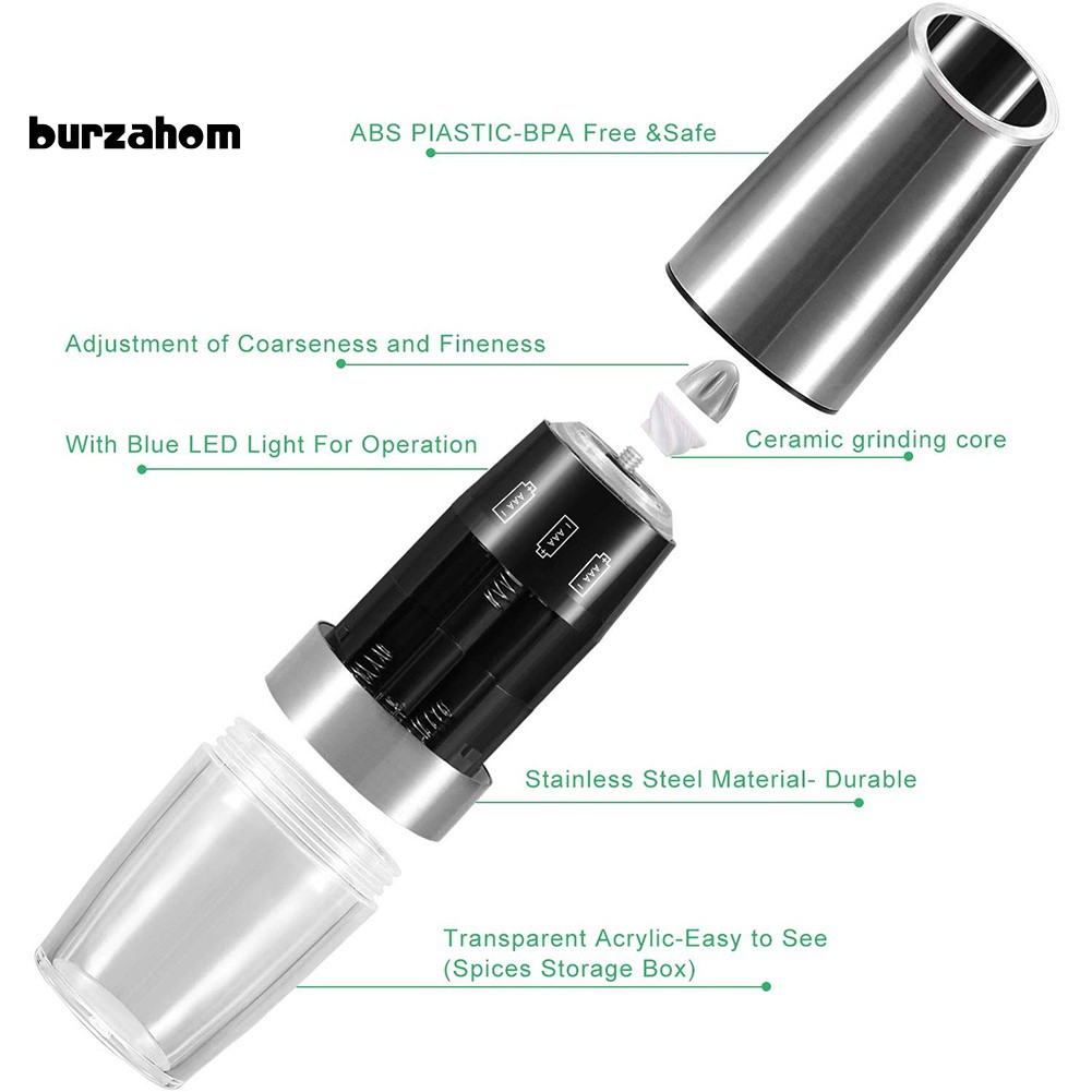 Tên sản phẩm: Máy xay tiêu Chất liệu: Thép không gỉ 201, ABS, Acrylic, Lưỡi dao bằng gốm Pin: 6 x Pin AAA (Không bao gồm) Đặc điểm: Đèn LED xanh dương, Sức chứa lớn, Kiểm soát trọng lực Kích thước: 6.3cm x 20cm/2.48" x 7.87" (Xấp xỉ)