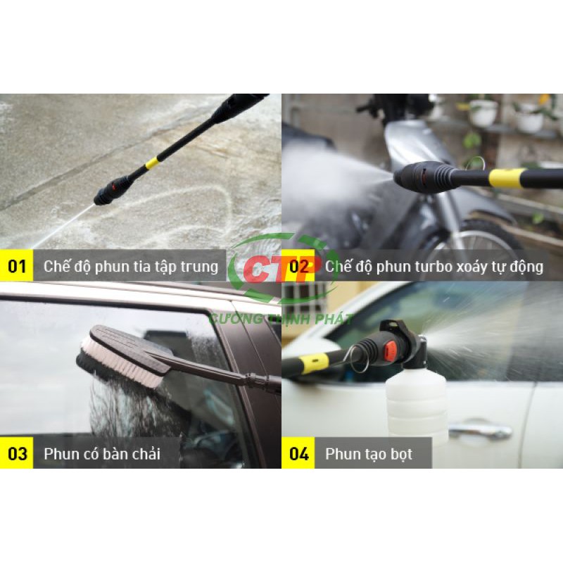 CẢNH BÁO AN TOÀN: Khi sử dụng bất kỳ thiết bị, dụng cụ máy móc nào thì yếu tố an toàn luôn được đặt lên hàng đầu, và máy bơm rửa xe áp lực cũng không phải là ngoại lệ. Quý vị vui lòng tuân thủ các quy tắc sau để đảm bảo an toàn khi sử dụng:. - Sử dụng các phụ kiện máy rửa xe đi kèm đúng theo hướng dẫn và mục đích sử dụng bởi nếu dùng sai mục đích thì có thể gây nguy hiểm. - Không sử dụng nước xà phòng, nước rửa chén hoặc hóa chất chứa axit pha loãng, dầu hỏa,… để rửa xe vì dễ gây ăn mòn và cháy nổ. - Không hướng vòi xịt vào người, vật, các thiết bị điện khác hay thân máy, các loài động vật... - Không sử dụng máy bơm rửa xe ô tô ở nơi dễ xảy ra sự cố cháy nổ. - Khi tháo lắp, vệ sinh hoặc thay đổi phụ kiện máy rửa xe cần phải tắt nguồn, rút dây điện để đảm bảo an toàn. * Chú ý: An toàn điện: phích cắm phù hợp ổ cắm, tránh xịt nước vào ổ điện, đặt ổ điện trên cao và không ẩm ướt, dây dẫn điện phải trong tình trạng tốt không bị hở.