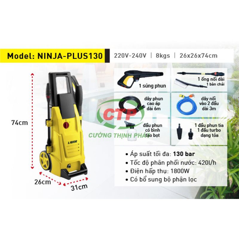 Máy phun áp lực nước Lavor ( Thương hiệu Italia ) NINJA PLUS 130 Máy hoạt động với 3 Piston thép, đầu bơm bằng trục đồng với van xy-lanh lắp sẵn. Áp lực tối đa lên đến 130 bar phun ra các tia nước vô cùng mạnh mẽ, rửa nhanh, không tốn nhiều sức. Máy phun xịt áp lực Lavor Ninja plus 130 thích hợp sử dụng trong gia đình: Rửa xe máy, rửa ô tô, phun xịt rửa bụi bẩn sân vườn quanh nhà: rêu mốc - đất bụi bắn dính do trời mưa ở sân, vườn, tường rào, mái nhà, xích đu, bàn ghế... Máy phun xịt áp lực cao Lavor Ninja plus 130 - Thương hiệu Italia lý tưởng để sử dụng cho gia đình. Máy phun rửa cao áp giúp tiết kiệm thời gian. Với áp lực nước cao giúp loại bỏ các vết bẩn một cách nhanh chóng, cho phép tẩy rửa các vết bẩn ở những vị trí khó thao tác như gầm xe, bánh xe một cách dễ dàng. Bên cạnh đó dòng máy này rất tiết kiệm nước, với áp lực cao dễ dàng làm sạch và đẩy đi mọi loại bụi bẩn, làm sạch nhanh nên lượng tiêu thu nước không cần nhiều. Bình đựng hóa chất tẩy rửa, xà phòng hỗ trợ việc xịt bay các vết bẩn cứng đầu trả lại độ sạch nhanh chóng hơn nữa.