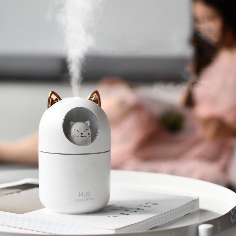 Máy Xông Tinh Dầu Humidifier Dung Tích 300ml Phun Sương Tạo Ẩm Giúp Giảm Khô Da, Nứt Nẻ Điều Hòa ĐỘ Ẩm Không Khí. - Chắc hẳn trong thời tiết nắng nóng bạn thường hay sử dụng máy điều hòa để làm mát và tạo cho riêng mình cảm giác dễ chịu. Nhưng bạn quên rằng việc ở trong môi trường điều hòa liên tục sẽ ảnh hưởng nhiều đến sức khỏe của bạn???Ngoài việc làm mát điều hòa sẽ làm da bạn khô hơn, trở nên nứt nẻ hơn và còn ảnh hưởng nhiều đến hô hấp. -Máy phun sương HUMIDIFIER giải pháp giúp bạn cân bằng độ ẩm không khí, với thiết kế hình thú dễ thương và khả năng phun sương với công nghệ sóng siêu âm giúp bạn thư giản với mùi hương tinh dầu dễ chịu. -Các hạt ION tỏa ra từ máy giúp cho khả năng lọc không khí được tốt hơn, giảm thiểu những bệnh liên quan đến hô hấp. - Tiết kiệm điện năng và tinh dầu so với các loại đèn xông tinh dầu truyền thống. Không gây ồn khi hoạt động, âm thanh <30dp. -Thích hợp làm quà tặng sinh nhật, tân gia, khai trương, đám cưới, ...
