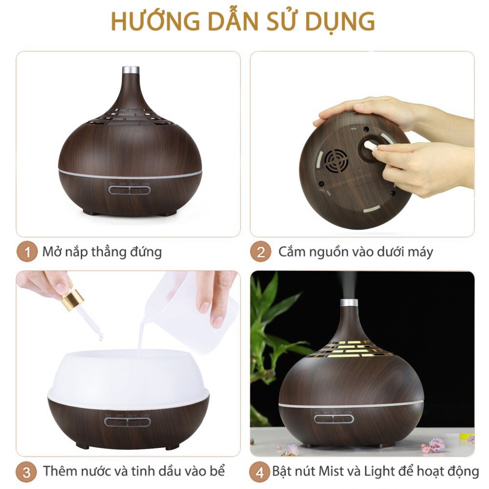 VÌ SAO BẠN CHỌN CHÚNG TÔI: ------------------------------- ✔ Máy Bền, Chạy Êm, kèm Remote, An toàn cho Trẻ nhỏ, được khách hàng Tin Dùng. ✔ Cam kết hỗ trợ 24x7. ĐẶC ĐIỂM NỔI BẬT ------------------------------- ✔ Thiết kế ấn tượng, mang ý nghĩa may mắn, tốt lành trong phong thủy, hạnh phúc trong hôn nhân, trường thọ,… ✔ Màu sắc vân gỗ tinh tế phù hợp với nhiều không gian khác nhau từ phòng khách, phòng ngủ, phòng làm việc, phòng trẻ nhỏ, spa,… ✔ Máy có dung tích lớn, có thể hoạt động liên tục trong nhiều giờ liền, có thể hẹn giờ 1H/3H/6H và tự tắt khi hết nước. Ánh sáng đèn nhiều màu có thể chọn màu sắc mong muốn hoặc tắt khi cần bóng tối hoàn toàn để ngủ. ✔ Tiếp kiệm điện năng, tinh dầu khi chỉ cần 3-4 giọt tinh dầu nguyên chất cho 100ml nước. ✔ Sóng siêu âm tách các phân tử nước đủ nhỏ để phân tán trong không gian, giúp lan tỏa tinh dầu hiệu quả, tăng độ ẩm phù hợp với phòng máy lạnh mà không làm hư hại các thiết bị điện tử. ✔ Mang hương thơm tự nhiên đến căn phòng của bạn, giúp thanh lọc không khí, giảm bụi bẩn, loại bỏ mùi khó chịu của vật nuôi, khói bụi trong nhà bạn. ✔ Món quà ý nghĩa dành cho bạn bè, gia đình trong những dịp lễ tết, khai trương, tân gia,…