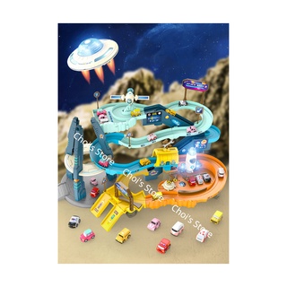 (kèm 4 xe nhỏ) Đường đua ô tô trạm du hành vũ trụ, đồ chơi bãi đậu xe gara ô tô có thang máy tự động