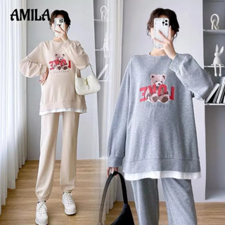 Bộ đồ AMILA gồm áo sweater tay dài in hình gấu và quần dài dáng rộng thời trang cho mẹ bầu