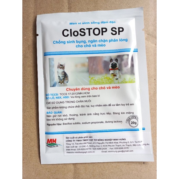 Men tiêu hoá/ Men vi sinh sống đậm đặc Clostop SP- gói 20g Phân khô - Giảm mùi hôi - Kích thích tăng trọng PB6 là một dạng vi khuẩn có lợi tăng sinh nhanh trong đường tiêu hoá,phóng thích chất hoá học có tên Surfactin A/B hạn chế và làm giảm vi khuẩn gây hại. Và: Kích thích tiêu hoá, Phân khuôn, giảm mùi hôi, Chống sình bụng khó tiêu,Ngăn chặn phân lòng cho cún,mèo Có thể sử dụng trực tiếp,pha loãng hoặc trộn thức ăn.