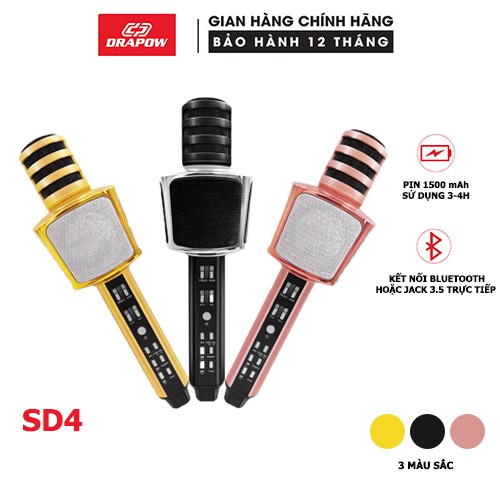 * Giới thiệu sản phẩm Micro kèm loa không dây DRAPOW - MD4 Kiểu dáng thân thiện, sang trọng, đẹp mắt. Tích hợp mic và loa trên cùng một sản phẩm. Kết nối: qua sóng không dây Bluetooth, hoặc kết nối dây trực tiếp qua jack cắm tai nghe 3.5 mm Kích thước bỏ túi nhỏ gọn thuận tiện cho bạn mang đi đâu tùy thích.. Dung lượng pin lớn cho phép sử dụng tới 3-4h đồng hồ. Tích hợp nhiều chức năng tùy chỉnh giọng hát ngay trên thân giúp bạn phối nhạc linh động. Sử dụng cho: điện thoại Smartphone, máy tính bảng, Android TV box, iPhone, iPad Trang bị loa hỗ trợ khả năng hát karaoke cực to, cực vang, âm thanh êm nghe cực đã. Rất tiện lợi làm loa thông báo, loa phát nhạc di động, mic nói. Tiện lợi hơn là bạn có thể tháo rời loa và mic hát riêng biệt.