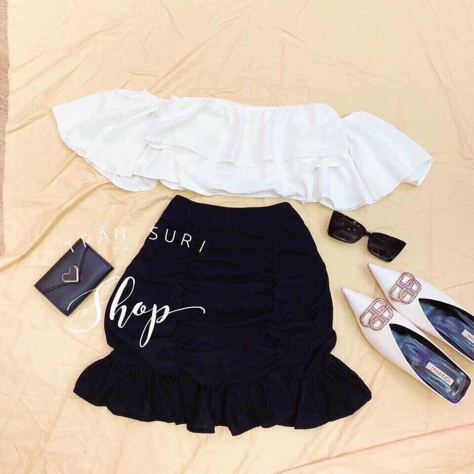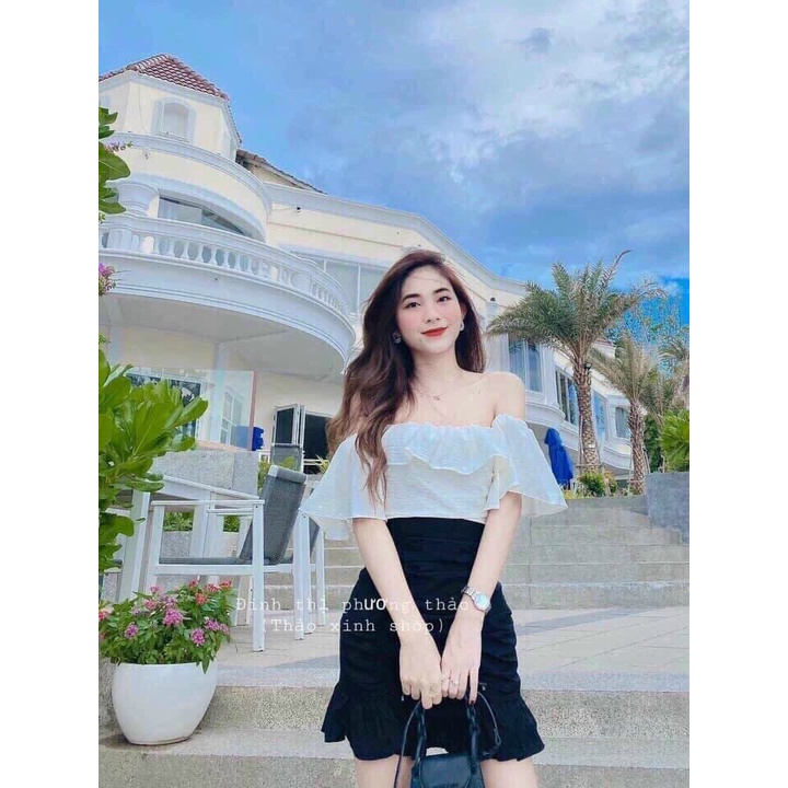 Giới thiệu [ Miễn Phí Ship 2022 ] Set váy trễ vai chất liệu kate, set váy áo trễ vai kiểu gấp kèm váy và ảnh thật