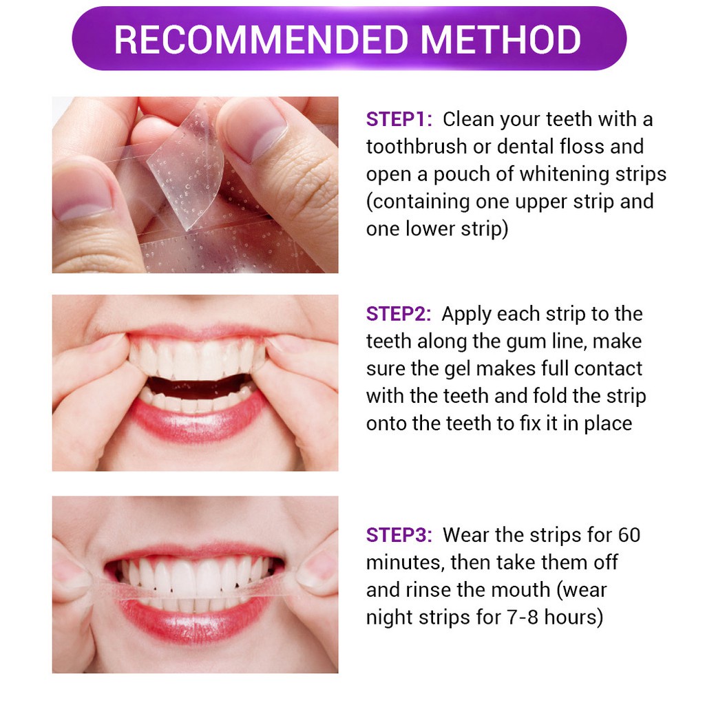 Làm thế nào để bạn có thể: Bước 1: Xé mở túi giấy bạc, lấy dải bằng tay khô và chấm khô khỏi lớp lót nền. Bước 2: Nấu trong gương, thoa gel dính lên răng trên và dưới. Bước 3: Tháo các dải và rửa gel trên teeeh sau 30 phút.