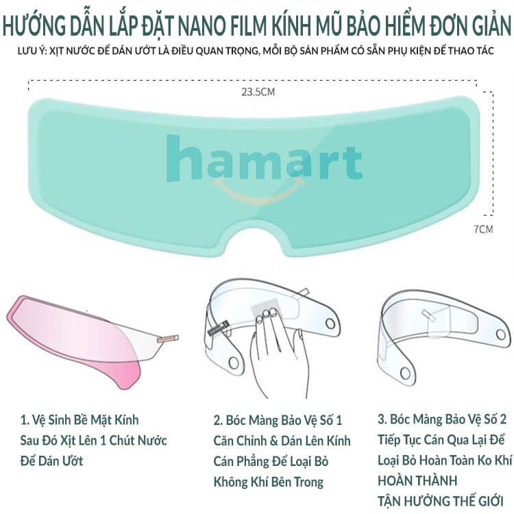💦Mỗi khi trời mưa to thì rủi ro gây thiệt hại do kính mũ bảo hiểm bị đọng nước, hạn chế tầm nhìn khiến bạn khó xử lý tình huống giao thông là vấn đề luôn thường trực với những ai ngồi sau tay lái những chiếc xe phân khối lớn, đặc biệt là Biker, Dân Phượt ✨Miếng Dán Chống Nước Mũ Bảo Hiểm Hamart chính là giải pháp tiện lợi cho vấn đề cấp thiết này - Với lớp NANO phủ film nhựa PET sản xuất theo công nghệ mới, chống đọng nước, đọng sương, chống mờ, chống loá thật tuyệt vời khi được hỗ trợ & đồng hành cùng sự an toàn của Bạn & Gia Đình *LƯU Ý 1: Sản phẩm có nhiều phân loại - Quý KH chú ý CHỌN ĐÚNG PHÂN LOẠI theo nhu cầu thực tế **LƯU Ý 2: Dán chống bám nước hoạt động trên bề mặt kính THUỶ TINH - Ko có tác dụng trên bề mặt Kính Nhựa
