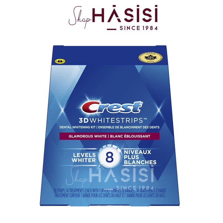 - Bộ sản phẩm làm trắng răng tại nhà an toàn cho men răng này sẽ giúp nụ cười của bạn trắng hơn 8 cấp độ. Chỉ cần thoa Crest 3DWhitestrips Glamourous White 30 phút mỗi ngày trong 14 ngày. - Gói này bao gồm 28 miếng dán làm trắng răng, 14 miếng dán cho răng trên và 14 miếng dán cho răng dưới, sẽ được sử dụng trong vòng 2 tuần.