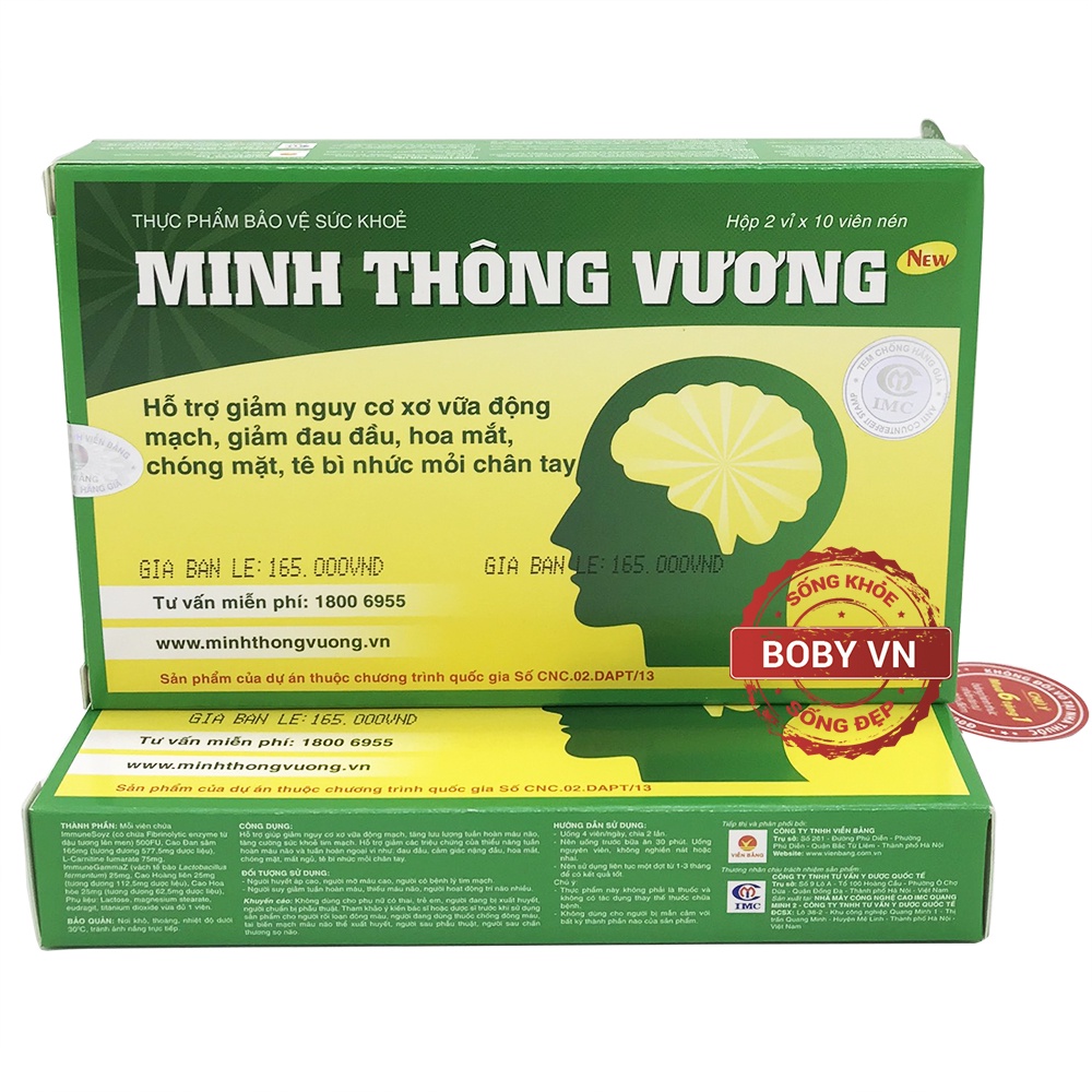 Sức Khỏe > Thực phẩm chức năng > Hỗ trợ sức khỏe > Minh Thông Vương hỗ trợ giảm nguy cơ xơ vữa động mạch, giảm đau đầu, hoa mắt, chóng mặt (Hộp 2 vỉ x 10 viên nén) - Boby
