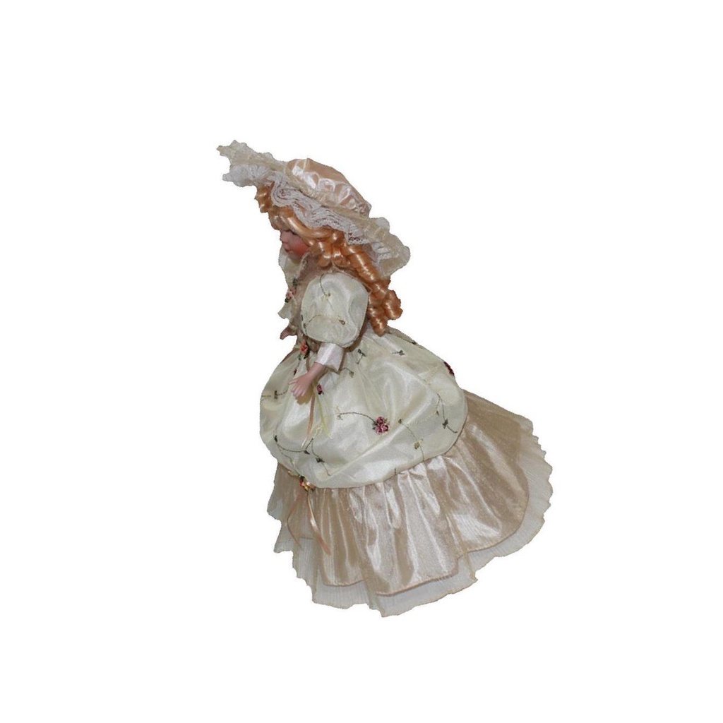 Búp bê cô gái đội mũ giày váy hoa màu be với mái tóc xoăn. ô và giá trưng bày