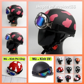 Mũ bảo hiểm nửa đầu cute bò sữa kính phi công nón bảo hiểm 1/2 kèm kính uv đi phượt màu đen hồng