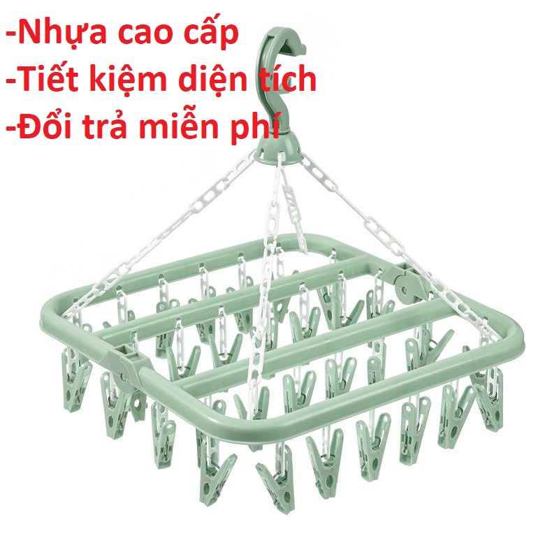 Thông tin sản phẩm móc treo quần áo 32 kẹp: -Chất liệu: nhựa an toàn -Trọng lượng 250g -Màu sắc: xanh biển, xanh lá, hồng -Kích thước: 32*32*34cm, xếp gọn 32 x 17,5cm Nhà sản xuất YIWU, mới 100% Đặc điểm sản phẩm móc treo quần áo 32 kẹp: -Dùng để phơi đồ nhỏ, tất, tã lót, đồ của trẻ sơ sinh, trẻ nhỏ… -Thiết kế tinh xảo, chắc chắn. - Tiết kiệm không gian. Một trong những công việc gây mệt mỏi và tốn thời gian nhất chính là việc giặt giũ quần áo cho cả gia đình. Và chắc chắn bạn đã gặp những vấn đề phát sinh gây phiền phức trong công việc sử dụng dây phơi đồ truyền thống. Móc chùm phơi quần áo với thiết kế hình vuông, giúp bạn phơi các quần áo trẻ sơ sinh, đồ nhỏ, khăn, tã lót, tất...một cách dễ dàng mà không sợ bị mất hay thất lạc do gió thổi bay. Móc phơi quần áo dạng chùm là giải pháp tiết kiệm không gian cho gia đình bạn đặc biệt là các gia đình có trẻ nhỏ. Khi không dùng bạn có thể gấp gọn lại để cất đi. Rất tiện dụng phải không ạ.