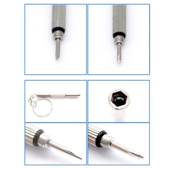 3-in-1 Accessory Tool: Flat head screwdriver / Phillips screwdriver / Star nut driver Used to repair or tighten up screws on variety eyeglasses, sunglasses, watches, cell phones With a keychain, portable and easy to carry Length without Keychain: Approx. 2.5 inch / 6.5 cm Material: Aluminum alloy Color: Silver