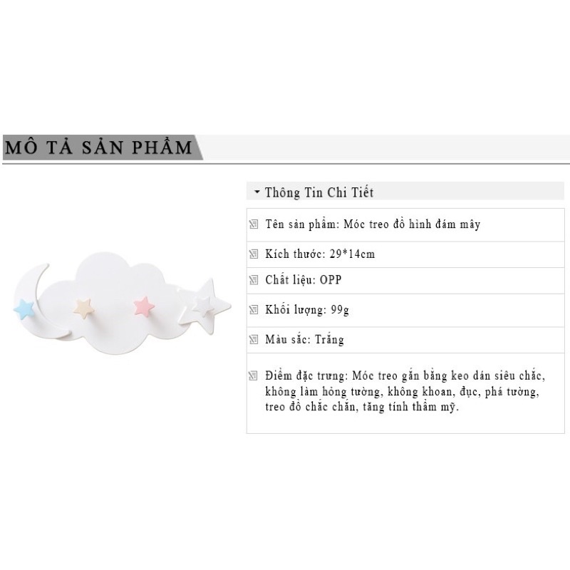 CÔNG DỤNG CỦA SẢN PHẨM Móc treo đồ hình đám mây tiện ích, móc dán tường treo đồ đa năng - Dùng để treo đồ quần áo, phụ tùng, trang sức - Góp phần tiết kiệm không gian, giúp cho căn phòng trở lên gọn gàng hơn - Sản phẩm rất phù hợp làm vật trang trí, decor phòng ngủ