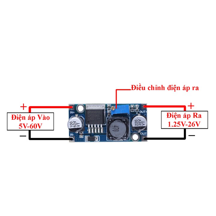 Thông Số Kĩ Thuật: Điện áp Vào của module hạ áp: 5V-60V Điện áp Ra: 1.25V-26V Dòng điện đầu ra cực đại : 3A Công Suất Max: 20W Kích thước:4.3cm * 3.0cm * 1.2cm