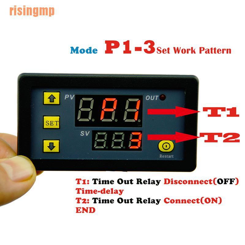 Hướng dẫn sử dụng: 1. Sau khi thiết lập dữ liệu, bạn phải đợi 6 giây, mô-đun đăng 6s tự động lưu dữ liệu bộ nhớ. 2. Nhấn phím SET một lần để vào chế độ cài đặt thời gian, đèn LED đỏ nhấp nháy, nhấn phím để tăng hoặc giảm thời gian cài đặt T1. 3. Sau khi cài đặt thời gian T1, nhấn nhanh phím SET lần nữa, đèn LED màu xanh lá cây nhấp nháy, và cài đặt thời gian bằng cách nhấn phím Time T2, cài đặt thời gian T2 hoàn tất, nhấn phím SET lần nữa, hệ thống sẽ tự động lưu cài đặt bộ nhớ thời gian hoặc đợi trong 6s, 6s module sẽ tự động lưu vào bộ nhớ dữ liệu. 4. Nhấn và giữ SET, vào chế độ cài đặt thông số: Có hai bộ thông số để người dùng chọn P0, P1. Nhấn nhanh SET ở chế độ hiện tại để chuyển đổi giữa P0 và P1. 5. Trong thông số P0 có thể được thiết lập bằng cách nhấn phím để điều chỉnh chế độ thời gian của riêng chúng. Trong thông số P1 có thể được thiết lập bằng cách cộng và trừ các phím chế độ làm việc. P0--0: Chế độ định thời T1 là thứ hai. P0-1: Chế độ định thời T1 là phút. P0--2: Thời gian T1 Chế độ thời gian là giờ. P1--0: Thời gian trễ T1, kéo rơle (bộ định thời gian T1) P1--1: Rơ le nhả sau thời gian trễ T1 (bộ định thời gian T1) P1--2: Trì hoãn thời gian T1, kéo rơle (bộ định thời gian T1), và sau đó nhả rơle sau thời gian trễ thời gian T2 (thời gian T2), sau đó kết thúc. P1--3: Rơle nhả sau thời gian trễ T1 (bộ định thời T1), sau đó thời gian trì hoãn T2, kéo rơle (thời gian T2), sau đó kết thúc. P1--4: Trì hoãn thời gian T1, kéo rơle (bộ định thời T1), và sau đó nhả rơle sau thời gian trễ T2 (bộ định thời gian T2), đạp xe. P1--5: Rơle nhả sau thời gian trễ T1 (bộ định thời T1), sau đó thời gian trì hoãn T2, kéo rơle (bộ định thời gian T2), đạp xe.