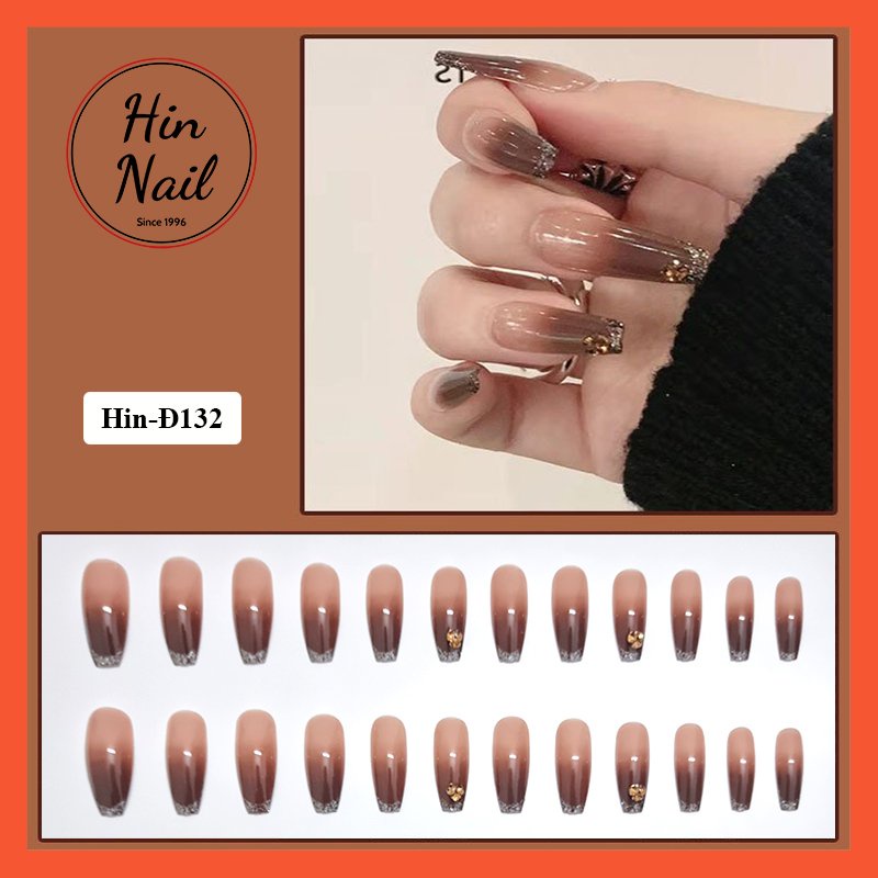 Giới thiệu móng tay giả đính đá form dài màu nâu họa tiết ánh nhũ hottrend