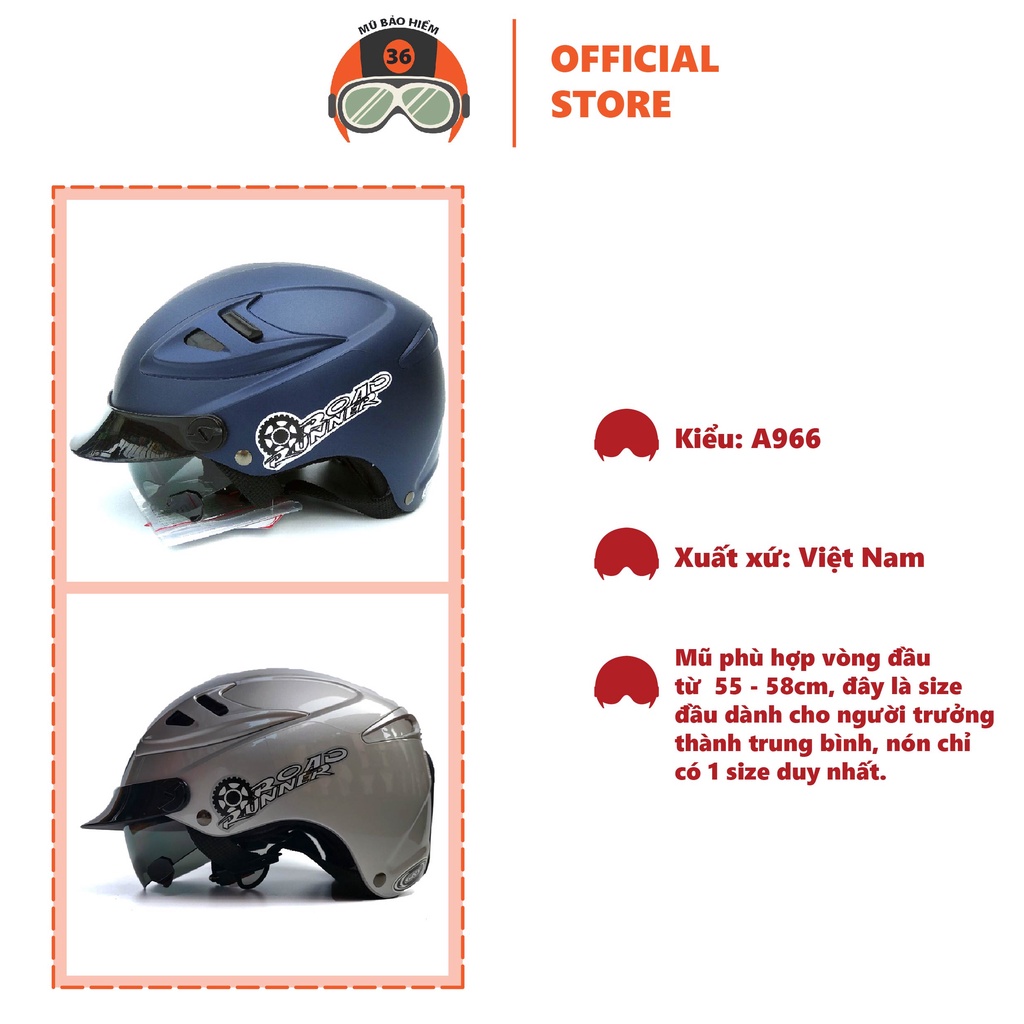 Thông số kỹ thuật: - Model: GRS A966 1 kính giấu - Kiểu mũ : nửa đầu tích hợp kính râm giấu - Chất liệu: nhựa ABS - Trọng lượng: 700gr +- 50gr - Lớp lót mũ kháng khuẩn có thể tháo rời để giặt hoặc vệ sinh - Mũ phù hợp với vòng đầu từ 55 - 58cm, đây là size đầu dành cho người trưởng thành trung bình, nón chỉ có 1 size duy nhất.