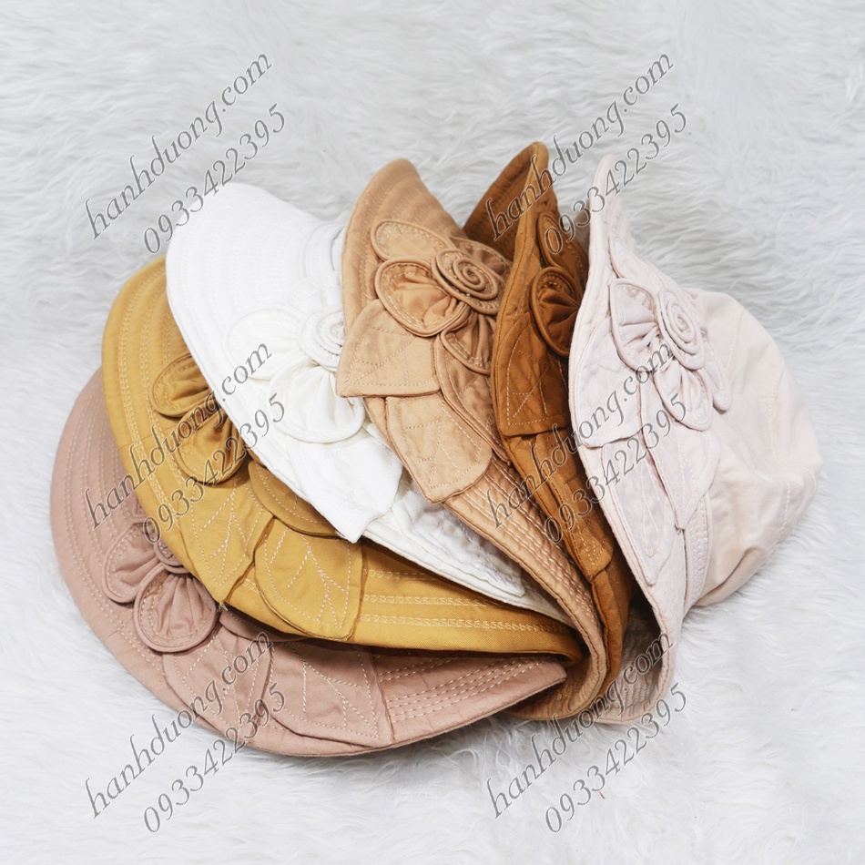 Mũ bo vành rộng 7cm nón tai bèo vành rộng gắn hoa và lá, vải cotton cao cấp của AT phù hợp cho nữ