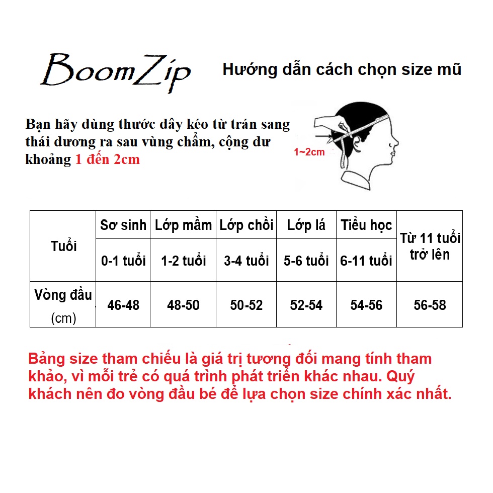 ______________ 🟥 BẢNG SIZE: ⭐️ Chu vi 48 cm cho vòng đầu 45-47cm Độ tuổi tham khảo 6 tháng -1.5 tuổi ⭐️Chu vi 50 cm cho vòng đầu 46-49cm Độ tuổi tham khảo 1~2 tuổi ⭐️ Chu vi 52 cm cho vòng đầu 50-51cm Độ tuổi tham khảo 2~ 4 tuổi ⭐️ Chu vi 54 cm cho vòng đầu 50-53cm Độ tuổi tham khảo 4 ~8 tuổi ⭐️Chu vi 56 cm cho vòng đầu 52-55cm Độ tuổi tham khảo 6~12 tuổi ⭐️ Chu vi 58cm cho vòng đầu 54-57cm Độ tuổi tham khảo thiếu niên, thanh niên, người lớn