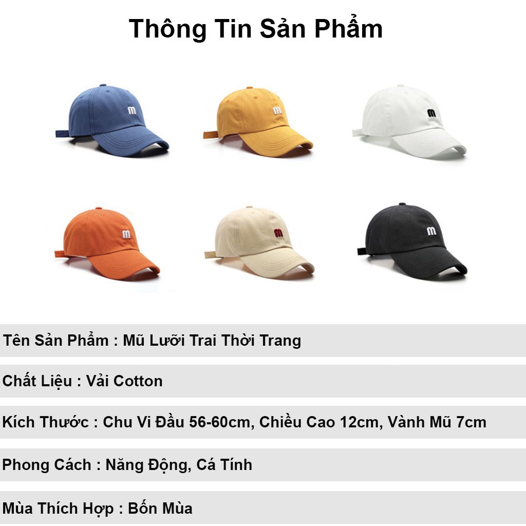 THÔNG TIN SẢN PHẨM : - Tên sản phẩm : Mũ lưỡi trai thời trang - Chất liệu : Cotton - Màu sắc : Nhiều màu - Kích thước : Chu vi vòng đầu 56-60cm ,chiều cao 12cm ,vành mũ 7cm - Phong cách : Thời trang trẻ trung cá tính