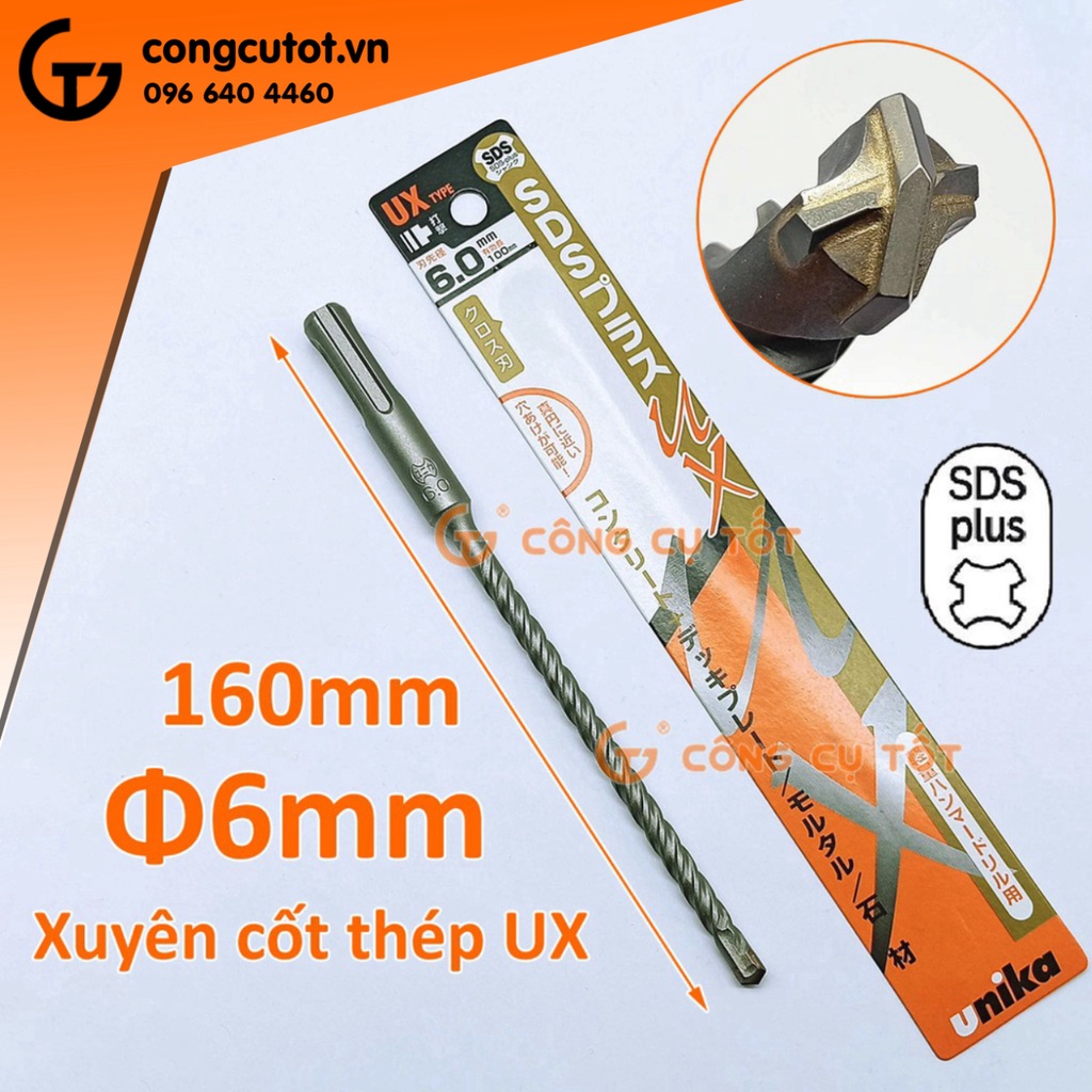 Chất liệu thép hợp kim độ cứng cao, có khả năng chịu lực và chịu nhiệt tốt. Đầu mũi khoan phủ Titanium bảo vệ bề mặt kim loại, chống gỉ sét, bào mòn. Đầu khoan UX, kết hợp lực quay và cắt cho khả năng khoan hiệu quả. Lưỡi cắt chéo giúp khoan sàn bê tông cốt thép dễ dàng. Lưỡi cắt chép tránh bị mắc kẹt, ít tổn hại rãnh cắt. Lỗ khoan được tạo ra khá tròn, dễ chèn bulong nở. Chuôi gài 4 khía SDS plus tương thích với nhiều loại máy khoan điện, máy khoan cầm tay. Thích hợp với máy khoan động lực (búa + xoay). Có thể khoan sàn bê tông cốt thép, khối gạch, vữa, ... Có tính ứng dụng cao trong các ngành công nghiệp, cơ khí, xây dựng, sửa chữa... Tuổi thọ rất cao nên hạ giá thành chi phí trên mỗi hố khoan một cách đáng kể.