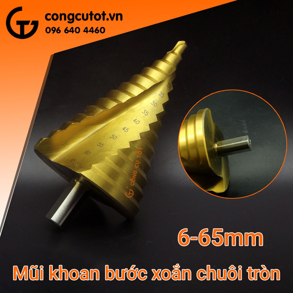 Mũi khoan bước xoắn chuôi tròn phủ titanium là mũi khoan tạo được nhiều cỡ lỗ khác nhau . Mũi khoan bước xoắn được làm từ thép gió HSS phủ titanium siêu cứng, bền bỉ , chịu lực chịu nhiệt tốt.Là 1 mũi khoan chuyên dụng khoan trên bề mặt sắt,thép,inox,đồng...