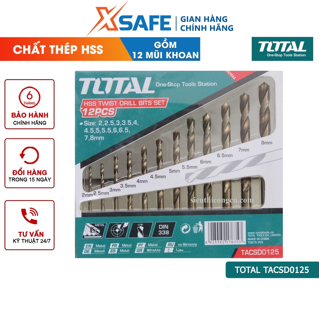 Giới thiệu Bộ mũi khoan kim loại HSS 12 chi tiết TOTAL TACSD0125, dao phay ngón chất liệu thép HSS, khả năng chống mòn cao - xsafe