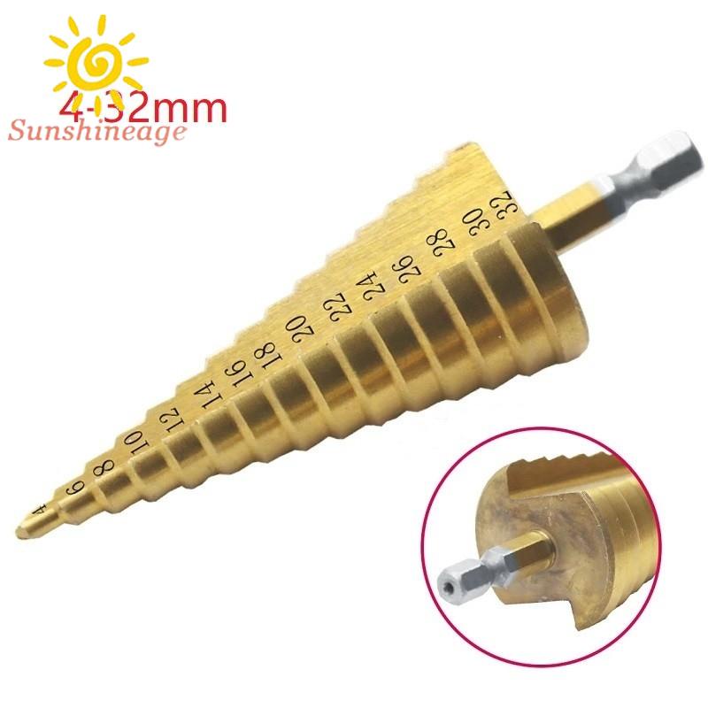 Thông số kỹ thuật ' *Chất Liệu * Thép tốc độ cao * Hoàn thiện bằng titan *Màu Vàng * Chiều dài ' Chiều dài 4-32mm ” Xấp xỉ . 10,2cm x 4,02 ' * Kích thước cắt khoan bước ' 4-32mm 15 bước ( 4-6-8-10-12-14-16-18-20-22-24-26-28-30-32mm )