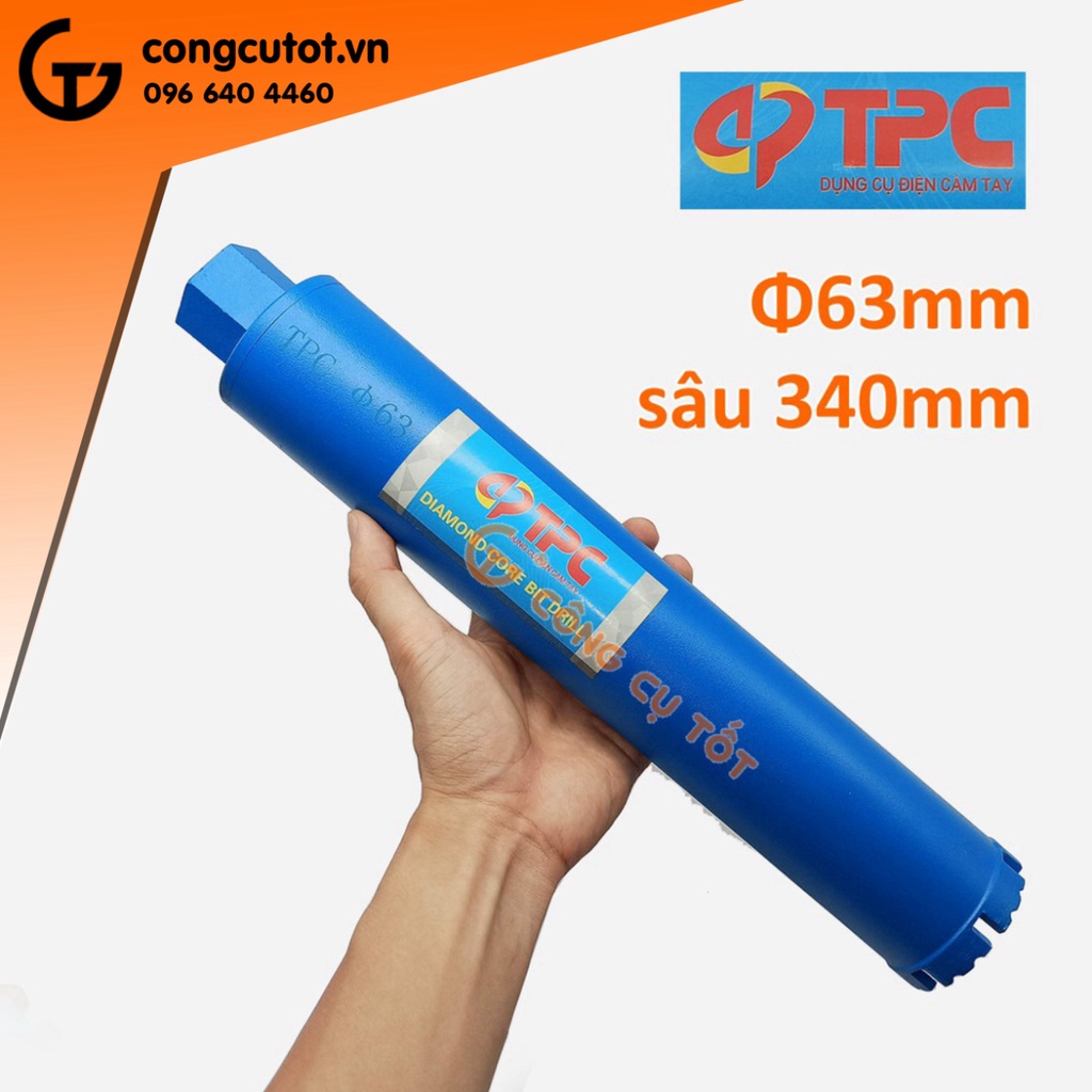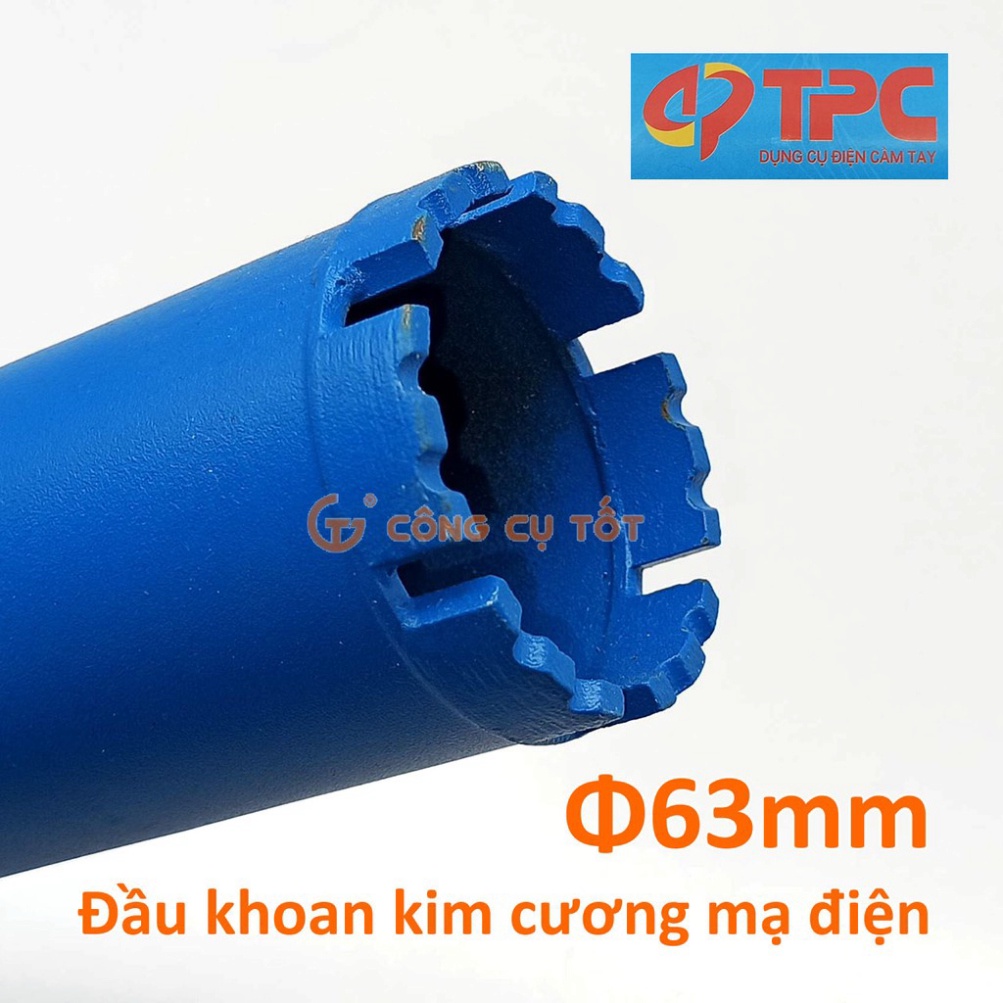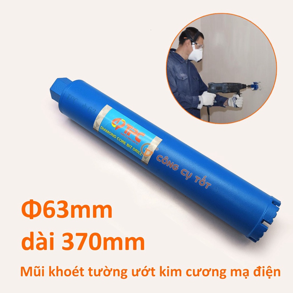 Kích thước Φ63mm sâu 340mm dài 370mm. Chất liệu: Thép hợp kim bền bỉ, có độ cứng cao, chống mài mòn, ăn mòn, ... Đầu khoan kim cương mạ điện chuyên khoan và bào mòn vật liệu cứng. Chân ren M22. Chỉ khoan ướt.