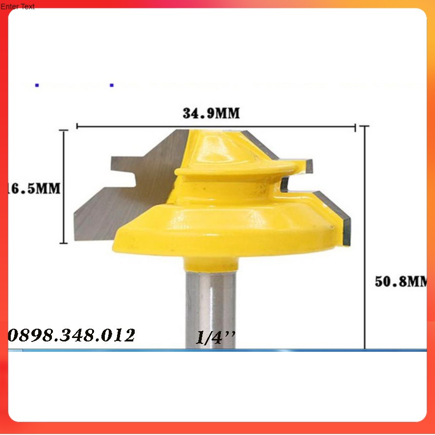 Chức năng sản phẩm: Mũi soi gỗ, mũi phay ghép gỗ gốc vuông hoa văn Vật liệu: Thép carbon C3 Micro-grain Tungsten Số lưỡi dao cắt: 2 cạnh dao Cốt: 6.35 mm , 1/4'' Chiều cao tổng thể: 50.8mm Góc phay: 45 độ Cao dao: 16.5mm Gia công gỗ dày từ: 10-12MM Màu sắc: Vàng Thông tin sản phẩm: