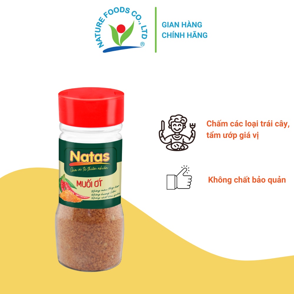 MÔ TẢ SẢN PHẨM Muối ớt Natas được sản xuất trên quy trình hiện đại kết hợp với công thức được nghiên cứu kỹ lưỡng, đạt tiêu chuẩn chất lượng vệ sinh an toàn thực phẩm, 100% tự nhiên, Không chất bảo quản, không phẩm màu, không hương liệu.Sản phẩm được làm từ các thành phần tự nhiên được lựa chọn kỹ lưỡng, an toàn cho sức khỏe, mang đến sự an tâm cho người dùng.