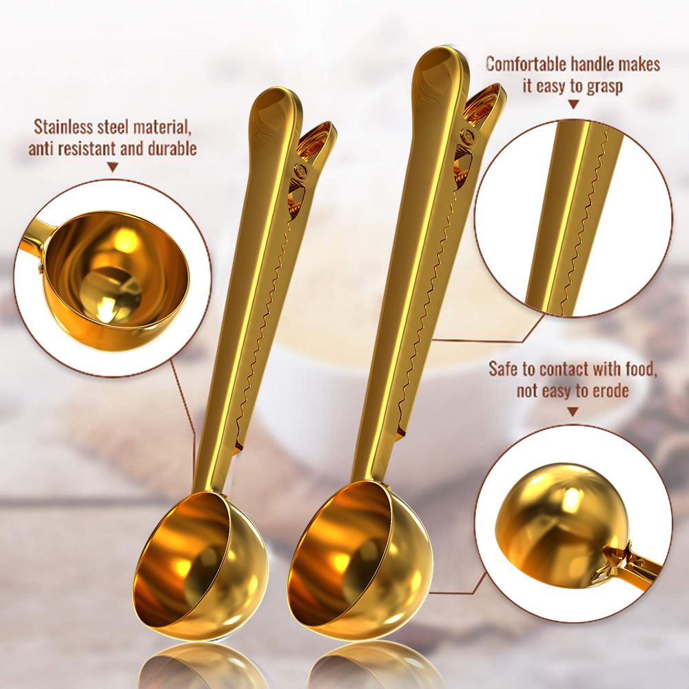 Kẹp muỗng cà phê 2.2 trong 1 - Muỗng gấp đôi như một kẹp niêm phong được làm bằng lò xo chắc chắn và thép không gỉ cấp thực phẩm để giữ cho túi cà phê luôn đóng chặt và tươi ngon . Muỗng chức năng kép đảm bảo các lượng cà phê bằng nhau Mỗi lần.