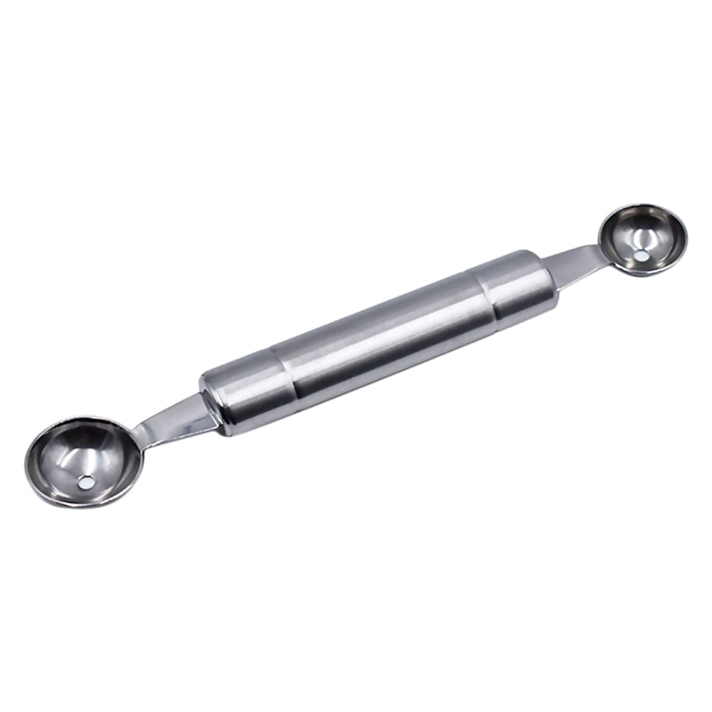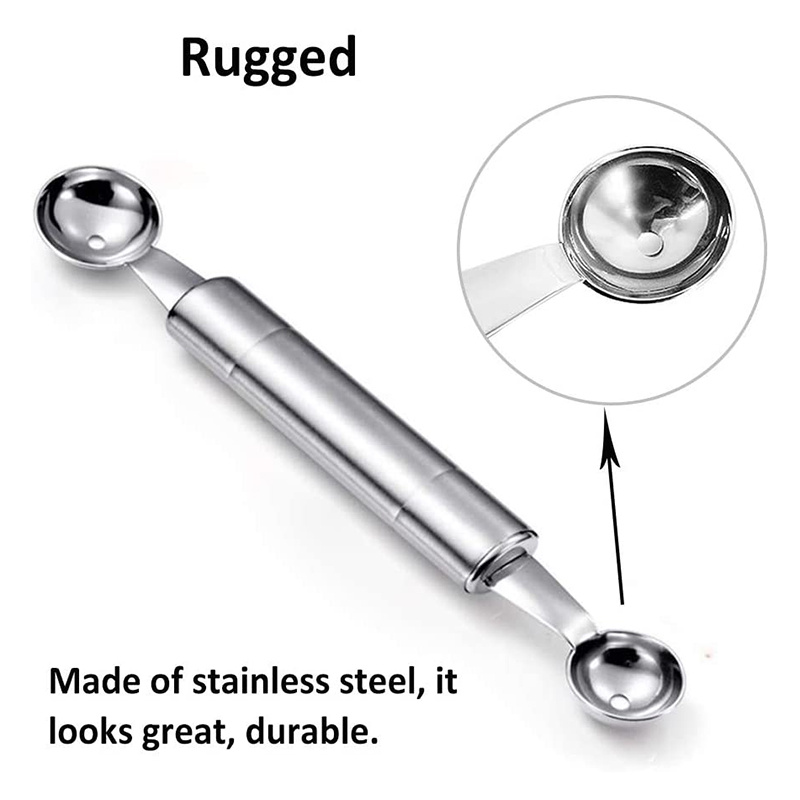 Feature: Color: Silver Material: Stainless steel Size: Length 20cm(7.87in), ball diameter: 3cm(1.18in), 2.5cm(0.98in) Package Includes: 1 x Double-side fruit scoop Note: Please refer to the measurement. Tiny measuring error is allowable in normal range. There might be a little color difference due to the monitor, camera or other factors, please refer to the physical item.