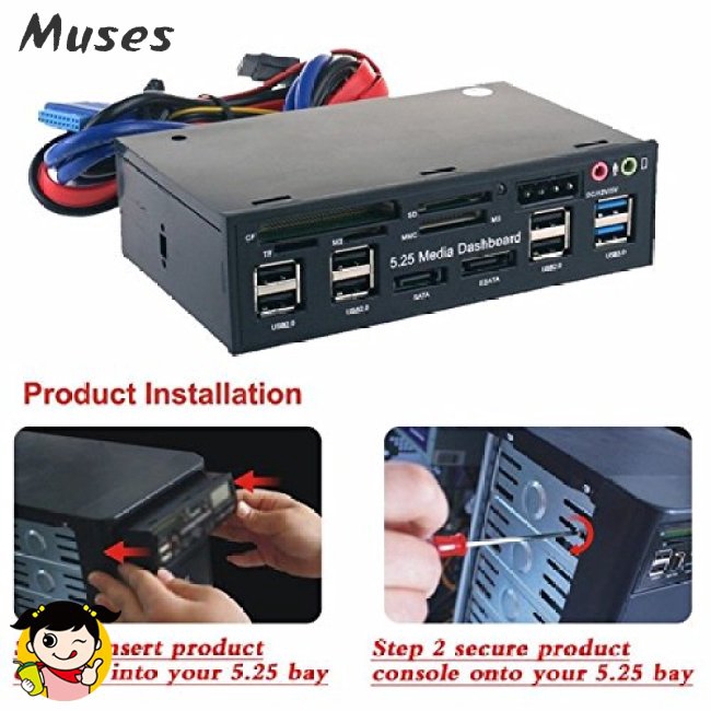 It is a multi-functional front panel with card reader,eSATA, SATA, audio ports, dual USB 3.0 hub and backward compatible with USB 2.0 and USB 1.1. eSATA ensures high speed data transmission rate between computer and personal external eSATA and USB devices without data damage and save time. Made of high quality smart chip, durable quality, super speed and safer data transfer, user-friendly performance. The card reader features five slots to provide easy and fast access to most popular cards, for SD card, CF card, TF card, M2 card and MMC/MS cards.