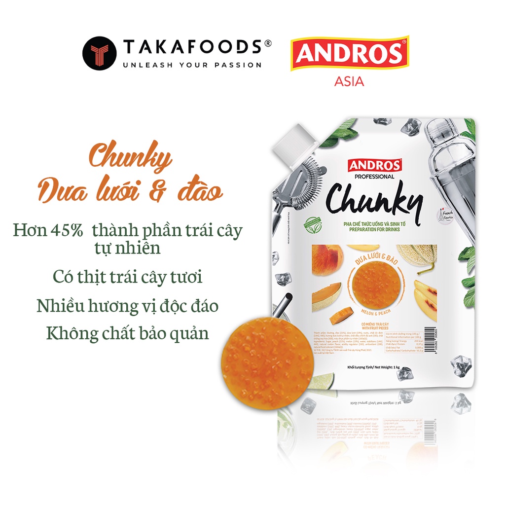 ANDROS ASIA là công ty con tại Việt Nam thuộc Tập đoàn ANDROS có trụ sở tại Pháp, có hơn 100 năm kinh nghiệm trong lĩnh vực sản xuất chế biến các loại trái cây, nguyên liệu chuyên dùng trong lĩnh vực thức uống và bánh ngọt. --- MỨT TRÁI CÂY CHUNKY - Sản Phẩm của Andros Asia - sự lựa chọn hoàn hảo cho các Bartenders và Coffee shop bởi: + CÓ hàm lượng trái cây tươi nhiều, hàm lượng trái cây dao động từ 45% - 60% tuỳ hương vị + CÓ miếng trái cây tươi với hương vị tự nhiên, cho người dùng cảm giác thanh mát, hậu vị fresh, dễ chịu + CÓ nhiều hương vị độc đáo khác biệt với thị trường, đặc biệt có những hương vị là sự kết hợp giữa hoa và trái + KHÔNG làm từ chất cô đặc + KHÔNG chứa Gluten + ĐƯỢC đóng gói trong túi nhôm Doypack 1KG giúp bảo quản và ngăn ngừa các ảnh hưởng của môi trường + ĐƯỢC ứng dụng đa dạng trong pha chế: Trà trái cây, Smoothies, Juice, Mocktail, Cocktail .... --- MỨT TRÁI CÂY CÓ XÁC CHUNKY DƯA LƯỚI - ĐÀO: Dòng mới nhất trong dãy 18 mùi hiện tại của Chunky - sự kết hợp tuyệt vời giữa Dưa lưới và trái đào "quốc dân" cho bạn 1 trải nghiệm Vừa lạ lạ - vừa quen quen - mà ngon không cưỡng 🥰🥰🥰 --- ĐÓNG GÓI: túi nhôm Doypack 1kg - Thùng 8 gói BẢO QUẢN ở nhiệt độ thường với sản phẩm còn nguyên Seal. Loại bỏ không khí trong bao, đóng kín nắp, bảo quản tủ mát , dùng trong 15 ngày sau khi sản phẩm được khui seal HSD: 12 Tháng kể từ ngày sản xuất