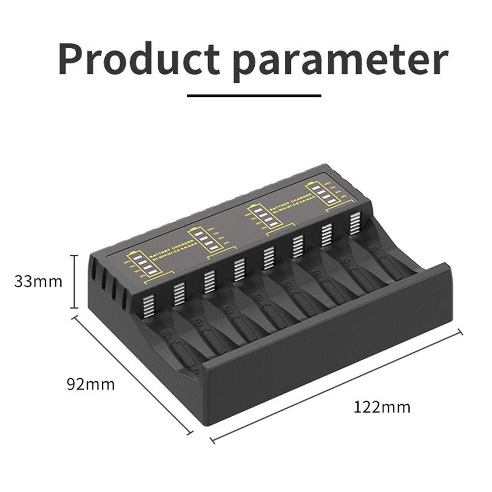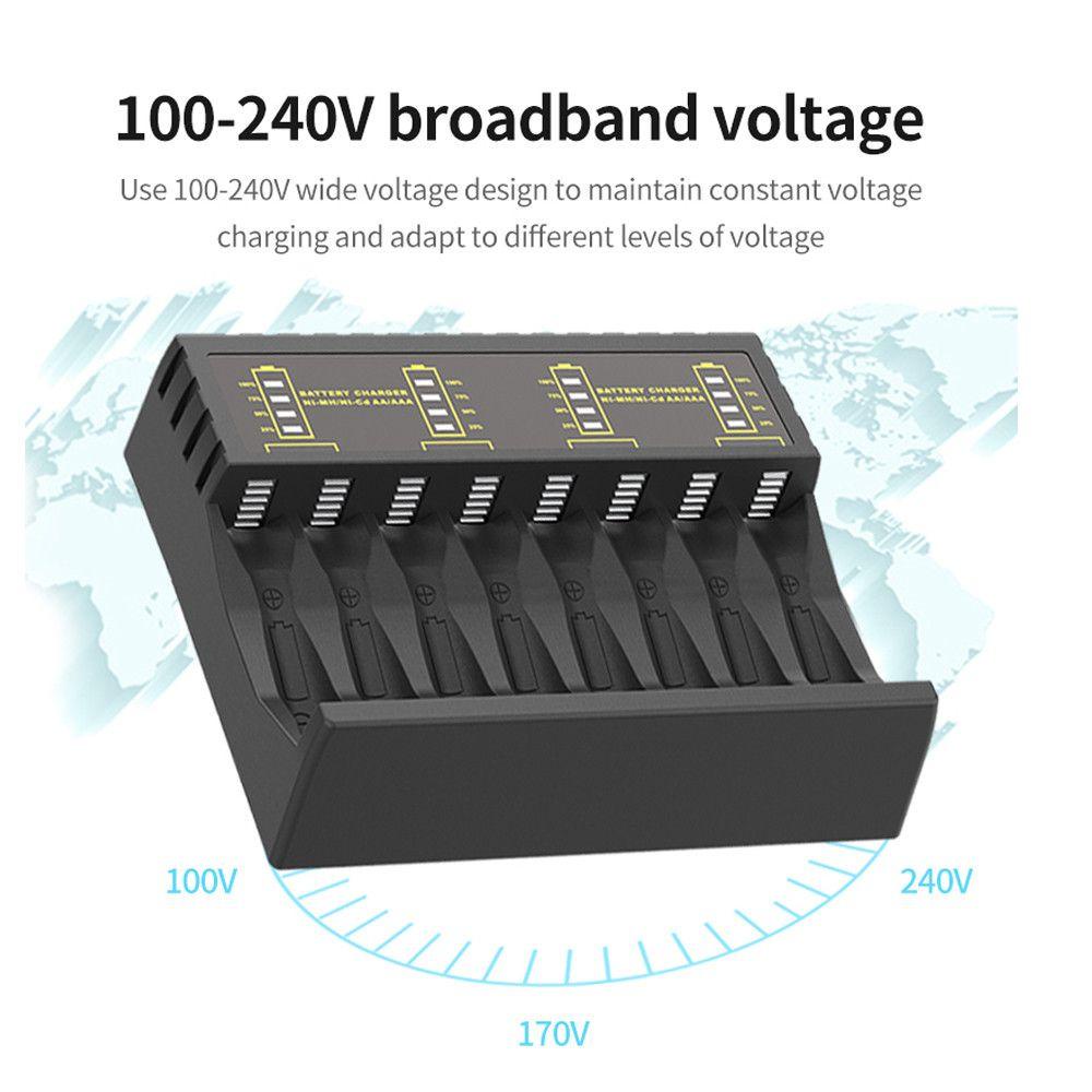 Thời gian sạc pin (hours) = dung lượng pin-1,2 dòng sạc (mA) Bộ sạc pin thông minh 8 khe cắm Bộ chuyển đổi đế sạc nhanh với màn hình LCD Bảo vệ ngắn mạch Đèn báo LED Di động Bền bỉ Phổ thông