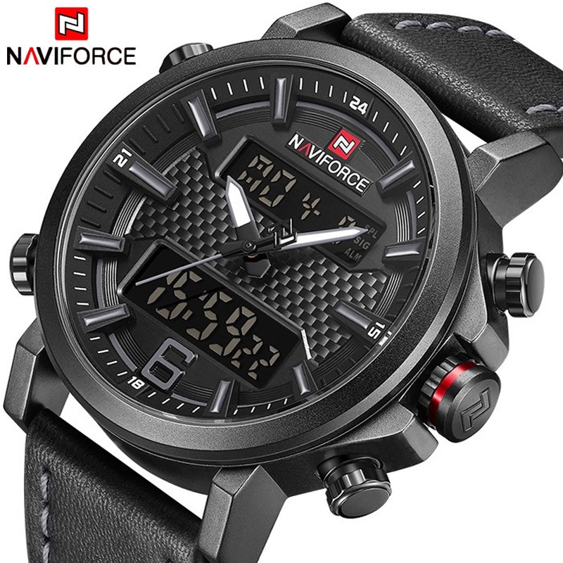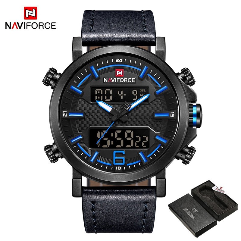 Thương hiệu: NAVIFORCE Chiều rộng dây đeo: 24 mm Chiều dài dây đeo: 25 cm Đường kính quay số: 46 mm Độ sâu chống thấm nước: 3Bar Loại bảo hành: Không bảo hành Loại sản phẩm: Đồng hồ thạch anh Phong cách: Thể thao Chức năng: ngày tự động, toàn bộ lịch, chống va đập, chống thấm nước, đồng hồ bấm giờ, đèn nền, nhiều múi giờ, màn hình LED Kiểu máy: Màn hình kép thạch anh Chất liệu vỏ: hợp kim Hình dạng quay số: Tròn Loại chất liệu dây đeo: Da Loại vật liệu cửa sổ: Hardlex Loại kim: Khóa Độ dày vỏ: 15 mm Đàn ông. Xuất xứ: Sản xuất tại Trung Quốc