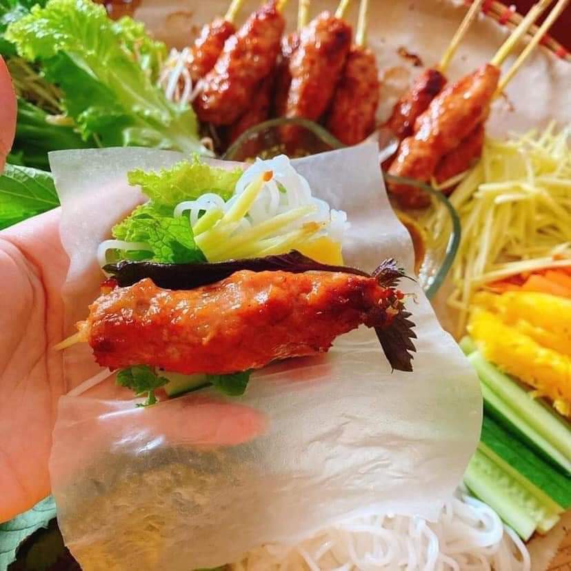 Giá sĩ #71k/khay 12c kèm nước chấm Nem lụi Huế về nướng lên or chiên lên rất là thơm. Miếng nem thì dai dai, ko cứng cũng ko mềm có độ sần sật nhẹ vì kết hợp cùng 1 ít mỡ heo trộn vào, nên lúc ăn dễ ăn hơn ngon hơn ko bị khô.