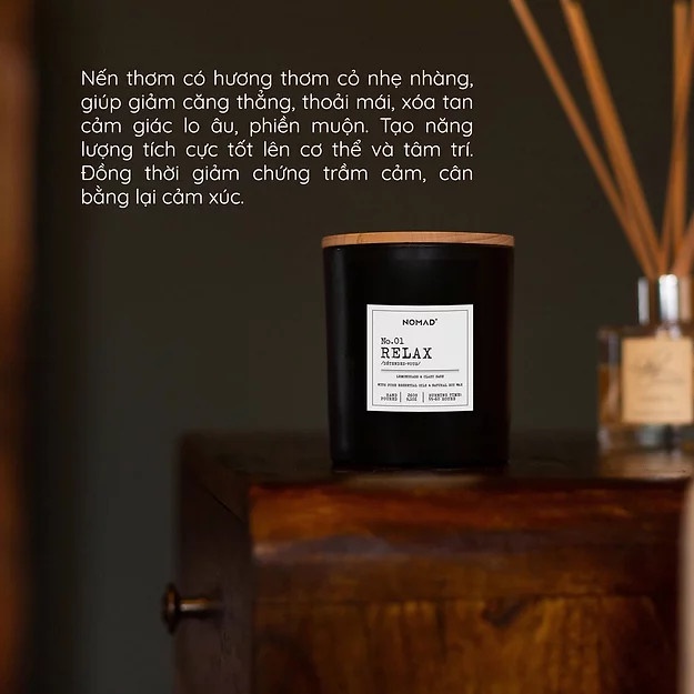 1. No.01 Relax: Nến thơm thiên nhiên có hương thơm cỏ nhẹ nhàng, giúp giảm căng thẳng, thoải mái, xóa tan cảm giác lo âu, phiền muộn. Tạo năng lượng tích cực tốt lên cơ thể và tâm trí. Cân bằng lại cảm xúc. - Tinh dầu nguyên chất: Sả Chanh, Xô Thơm, Vỏ Chanh