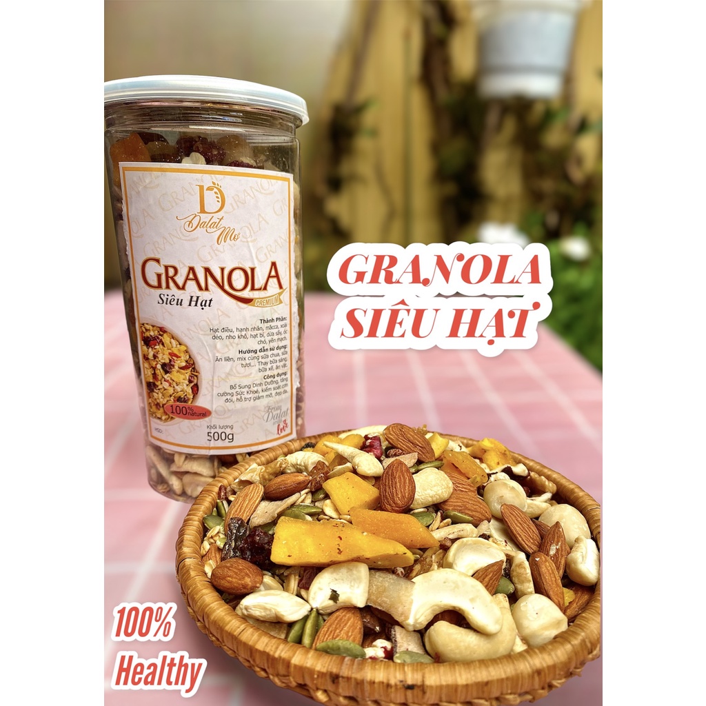 Là tên gọi của một hỗn hợp các loại hạt và Trái cây sấy lạnh Tốt cho sức khoẻ .Trong đó có 👉 Hạnh Nhân 👉 Măcca 👉 Hạt Điều 👉Óc Chó 👉 Hạt Bí Xanh 👉 Nho Khô 👉Dừa sấy 👉 Yến Mạch 👉 Gạo Lứt Riêng Granola nhà Linh thì toàn là hạt cao cấp,mix theo tỉ lệ cân bằng,Yến mạch chỉ chiếm 5%,trái cây chua ngọt. Vậy nên,hương vị thơm ngon,dễ ăn Có Thể Mix Cùng Sữa chua,Hoặc ăn không. hotline: 0944582879 Địa chỉ:11D Hoàng Diệu- P5-Tp Đà Lạt