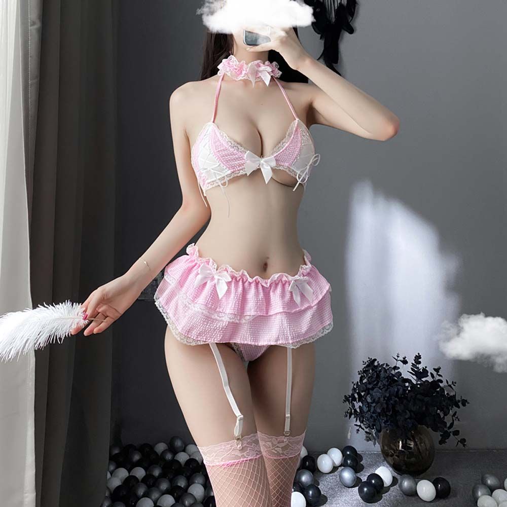 Size: One Size Fit 40-65kg Gender: Female Iterm: Lingerie Package include: 1*top+1*skirt+1*thong (not include collar,fan and stockings)Material: Polyester Color: Blue,Orange,Pink